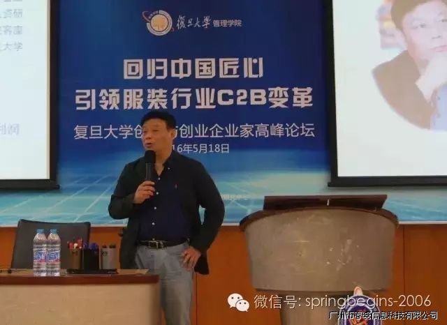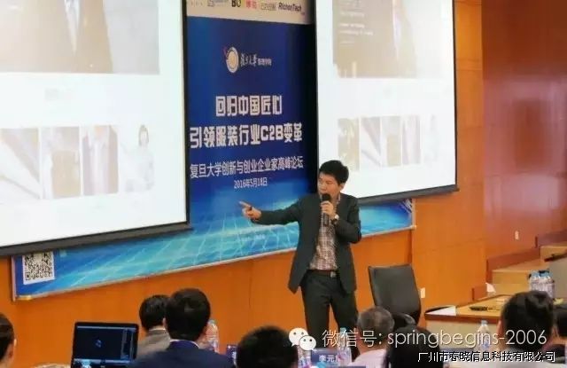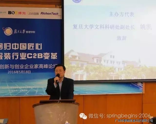 5月18日下午13:00,万众期待的“引领服装行业C2B变革,创新与创业企业家高峰论坛”在复旦大学管理学院如期召开并于下午17:30完美落幕,本次论坛由复旦大学管理学院主办、广州k8凯发信息科技有限公司协助举办,会场内座无虚席,200余人到场参会。论坛邀请了多位资深学者、成功企业家等重磅嘉宾纯干货主题演讲,受到广泛好评,会议进行中掌声持续响起。
