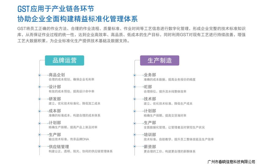 k8凯发GST采用行业通用的动作标准,可对缝制品行业的裁床、车缝、手工、烫、检验、包装等生产环节进行动作分析及时间研究,形成企业管理所需的技术标准和工时标准。为企业推行精益标准化生产提供数据及工具。通过GST动作代码,可以准确描述每一个员工每天的所有作业过程,来帮助员工建立标准作业方法,同时提供准确的作业时间。通过标准工时对员工进行效率评估及合理分工,让产线最大限度达到平衡状态,减少效率损失; GST帮助企业建立工艺数据库,建立全面的知识管理,助力企业数据化,标准化,科学化管理,让应用成本下降,构建时代万恒精益标准化管理体系,打造有竞争力的纺织服装生态链。