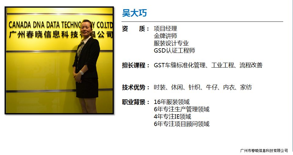 而且,这套系统本身所具备的无可比拟的优点也保证了它的可行性: ,这套系统吸收了原来英国科学的,先进的精华部分,经过了专家的严格论证,从而使时间的设立纳入了标准的技术因素,具有相当的可靠性。第二,它是建立在作业动作动素化、动素时间标准化的基础上,避免了以往现场测时所带来的人为因素的误差,使得工序时间更为准确,做到单价更为公平、合理。第三,它在原有的基础上进一步改善了作业方法和动作,使浮余进一步减少,从而使效率得到大限度的提高。第四,它是专业人士为缝制设计的一套很好的车缝培训教材,可以帮助员工提高车缝水平。第五,GST对于k8凯发来讲更易于学习和接受,它的代码采取的是中文简称的首写字母。由此看来,这种即保障员工收入的公平、合理,又能提高k8凯发员工整体技术水平的贤举良措,k8凯发又有什么理由不去信任它,支持它呢?